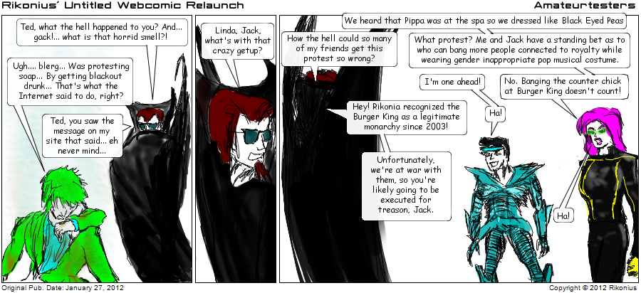 80's A. G. Ent activism adverts Aegir Aflac Al Gore Alan Rickman aliens alternate universe Anderson Angry Birds anime Anton La Vey Apollo Ares asplode Bad Andy Batman BDSM Billy blood blood hoses Bob Ross bodily fluids books bootleg brain brains Buffy butts cancellation candy cannibalism Captain  Riko Caruso Cheers Cheney Chi-Potle Chick-Fil-A Chris Dodd Christian Bale CIA cleanse the city Colin Firth comics Community computers conspiracy controversy costume costumes Craig Ferguson crash creepy stories crime Cthulhu customer service cute nonhuman dad jokes Dark Pantheon death Death Note Debug Demoncloake detective Deus Ex DGK dimensions dinosaurs Dispy Dogma Donald Trump doom doppelganger Dora Kent Dr. Jansen Dr. Who dreams Droid drugs Dubya eco El Rico de Nion elf engineering England eye carumba! eye lasers fan fiction farts FIFI filler Finland fire firefly flash forward food foot freaks French Maid Drone Friday the 13th fundies funky science funny hat furries Game of Thrones game show gay rights gearing up ghost gimp ginormous stuff Giorgio Tsoukalos Gllllyxxngragcht goat gods goth gross Gulliani guns hair hand to hand Hannibal hat haunted Hayden Panettiere HD 10180 heads Hellstar Remina Heroes Hitman holidays home base Hostess fruit pies hypertime injury internet iPad Ivan Commienov Jack Jack Chick Jim Cramer John Green John Lennon Jugularnaut Junji Ito Katy Perry kersplat Kevin Bacon Kraken lazy Lego lesbians Lincoln Lind-B Linda Lite Warriors lizard LJ Loki Lords of Acid Louis C.K. Louise Fletcher Lucinda mad science Madonna magic magic weapon manga Marvel Mass Effect Mass Effect 3 ending Mayan Apocalypse Megatron melded horrors memes meta Metallica Miley Cyrus milk MIP mistaken identity MIT monster monsters Morgan Freeman MOTU movies Mr. T Muppets music names nerdfighters New Years nightmare fuel ninja Nixon Nocifer-Auto Norway NSFW nudity Nurse Rached Odin olde fashioned other webcomics overreaction parody Pat Buchanon Patrick Stewart pervy planets Pluto politics pollution pop culture porn site Portal powers pranks property damage protest psychology public relations puke pursuit raccoon Ragnarok Ralph Nader rapture Ratchet re-entry reality show Red Lobster regent Regis religion Richard Marx Rifts Riko Riko's a good friend Riko rampage Rikonia robot rollin' coal roomba Ross Faeon royals RPGs RSS Feeder Sally Sandman Santa Scanners science Seapy Sesame Street severed head ShamWow sharks Sheila Sherlock shinigami Shortpacked Siren Siri sitcom Sky-Lynx Skyrim Smokey the Bear social media SOPA space Spider-Man sports squish Star Trek Star Wars Stargate starship superboy prime Superman Supernatural swords Talent Show talk show tech Ted teleport The Americans The Following the Lemonade Kid the Rock theft Theo thinkgeek Thor time travel toilet topical transformer Transformers trap travel Tron tropes TV U-Verse underwear Unicron urine utility suits vampire Van Damme Van Helsing video games violence voice actor vuvezela Washington Wonder Woman woodchipper X-Men Yodazuna Zachary Quinto Zeus zombie