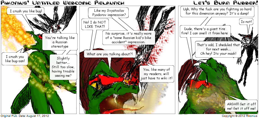 80's A. G. Ent activism adverts Aegir Aflac Al Gore Alan Rickman aliens alternate universe Anderson Angry Birds anime Anton La Vey Apollo Ares asplode Bad Andy Batman BDSM Billy blood blood hoses Bob Ross bodily fluids books bootleg brain brains Buffy butts cancellation candy cannibalism Captain  Riko Caruso Cheers Cheney Chi-Potle Chick-Fil-A Chris Dodd Christian Bale CIA cleanse the city Colin Firth comics Community computers conspiracy controversy costume costumes Craig Ferguson crash creepy stories crime Cthulhu customer service cute nonhuman dad jokes Dark Pantheon death Death Note Debug Demoncloake detective Deus Ex DGK dimensions dinosaurs Dispy Dogma Donald Trump doom doppelganger Dora Kent Dr. Jansen Dr. Who dreams Droid drugs Dubya eco El Rico de Nion elf engineering England eye carumba! eye lasers fan fiction farts FIFI filler Finland fire firefly flash forward food foot freaks French Maid Drone Friday the 13th fundies funky science funny hat furries Game of Thrones game show gay rights gearing up ghost gimp ginormous stuff Giorgio Tsoukalos Gllllyxxngragcht goat gods goth gross Gulliani guns hair hand to hand Hannibal hat haunted Hayden Panettiere HD 10180 heads Hellstar Remina Heroes Hitman holidays home base Hostess fruit pies hypertime injury internet iPad Ivan Commienov Jack Jack Chick Jim Cramer John Green John Lennon Jugularnaut Junji Ito Katy Perry kersplat Kevin Bacon Kraken lazy Lego lesbians Lincoln Lind-B Linda Lite Warriors lizard LJ Loki Lords of Acid Louis C.K. Louise Fletcher Lucinda mad science Madonna magic magic weapon manga Marvel Mass Effect Mass Effect 3 ending Mayan Apocalypse Megatron melded horrors memes meta Metallica Miley Cyrus milk MIP mistaken identity MIT monster monsters Morgan Freeman MOTU movies Mr. T Muppets music names nerdfighters New Years nightmare fuel ninja Nixon Nocifer-Auto Norway NSFW nudity Nurse Rached Odin olde fashioned other webcomics overreaction parody Pat Buchanon Patrick Stewart pervy planets Pluto politics pollution pop culture porn site Portal powers pranks property damage protest psychology public relations puke pursuit raccoon Ragnarok Ralph Nader rapture Ratchet re-entry reality show Red Lobster regent Regis religion Richard Marx Rifts Riko Riko's a good friend Riko rampage Rikonia robot rollin' coal roomba Ross Faeon royals RPGs RSS Feeder Sally Sandman Santa Scanners science Seapy Sesame Street severed head ShamWow sharks Sheila Sherlock shinigami Shortpacked Siren Siri sitcom Sky-Lynx Skyrim Smokey the Bear social media SOPA space Spider-Man sports squish Star Trek Star Wars Stargate starship superboy prime Superman Supernatural swords Talent Show talk show tech Ted teleport The Americans The Following the Lemonade Kid the Rock theft Theo thinkgeek Thor time travel toilet topical transformer Transformers trap travel Tron tropes TV U-Verse underwear Unicron urine utility suits vampire Van Damme Van Helsing video games violence voice actor vuvezela Washington Wonder Woman woodchipper X-Men Yodazuna Zachary Quinto Zeus zombie